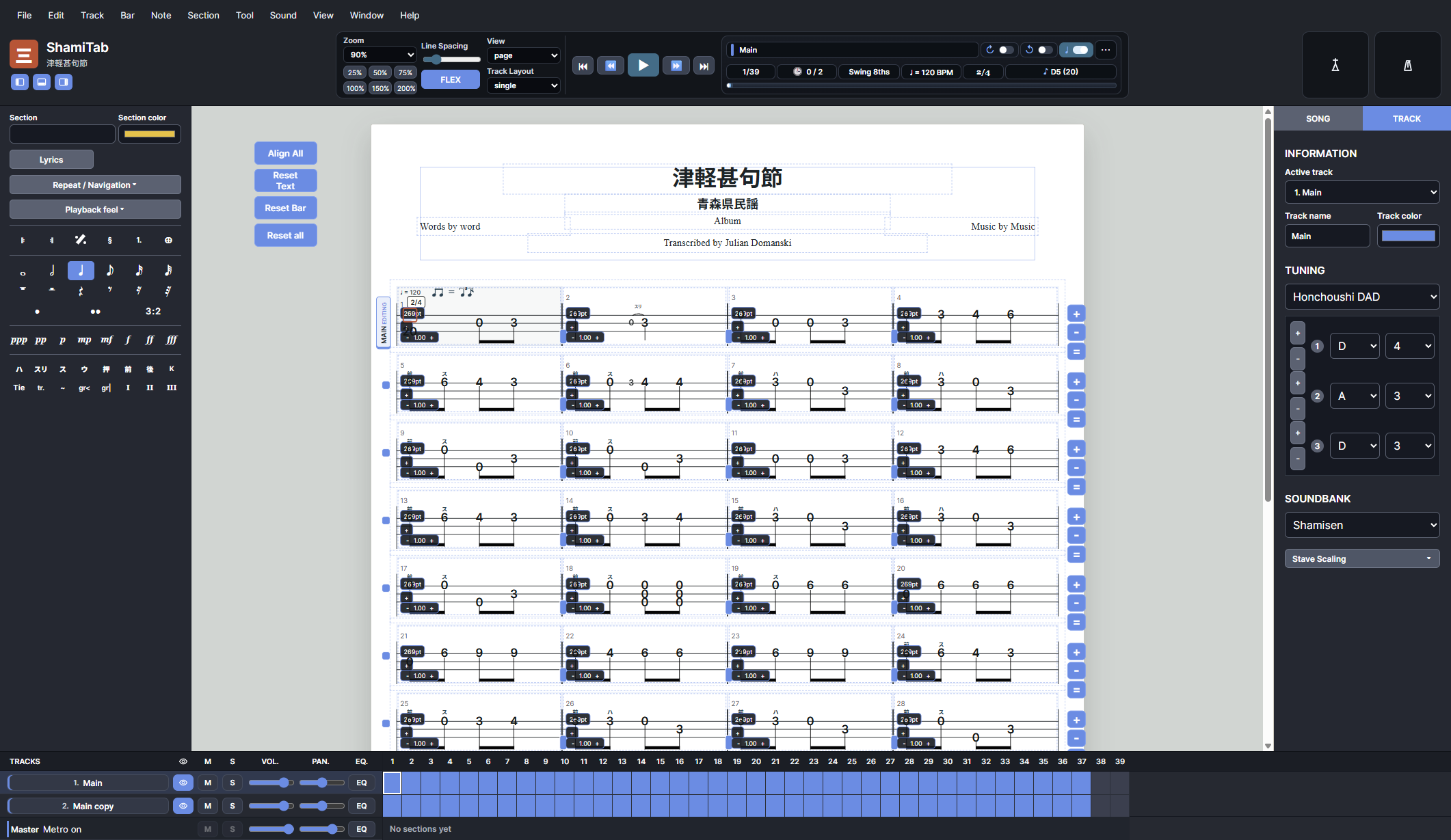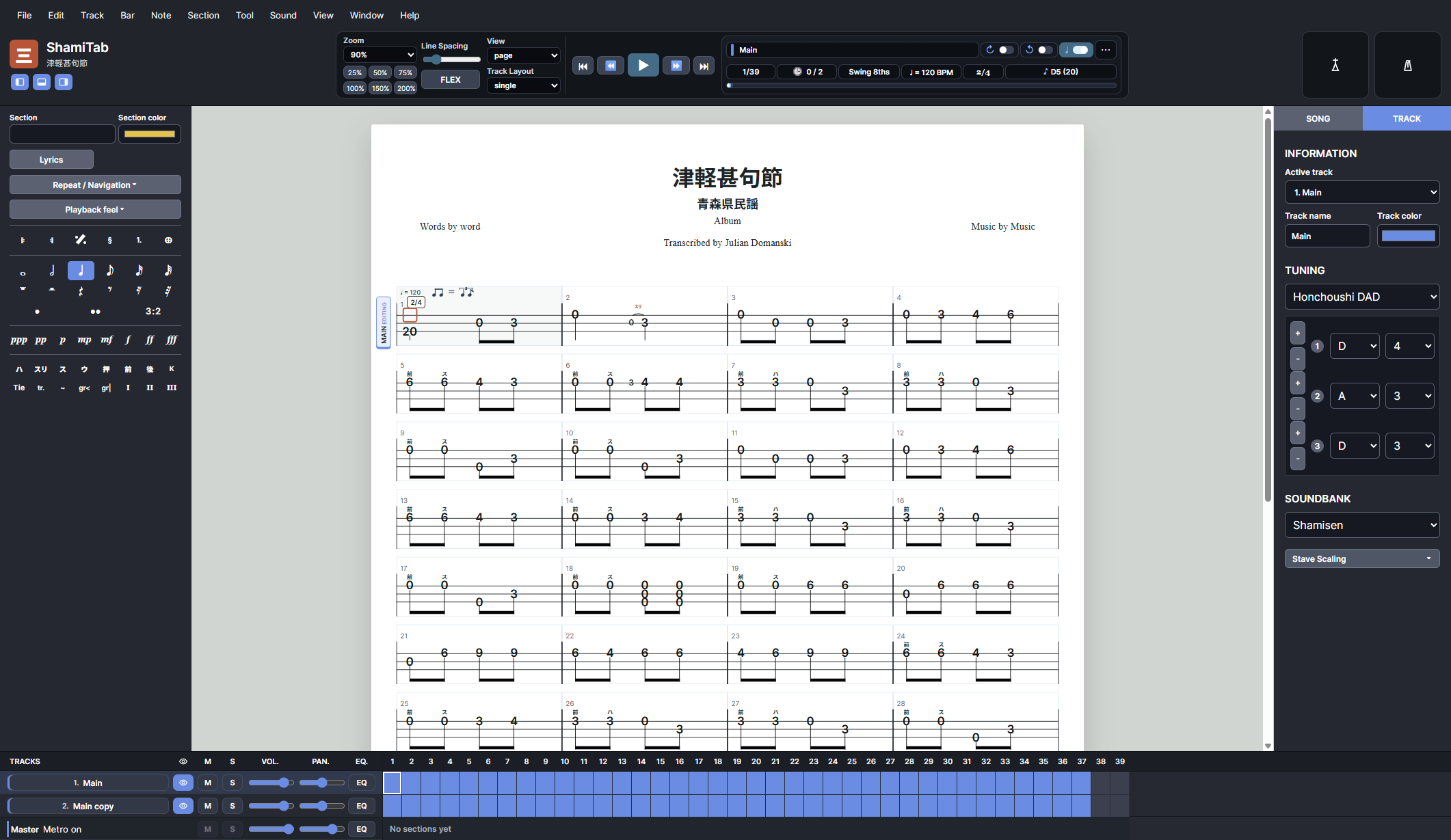 - Shamisen-focused score editor built specifically for notation, tab, playback, and layout work